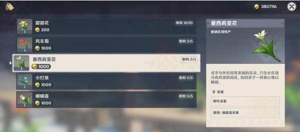 3、和她对话可以选择购买鲜花,其中就有塞西莉亚花,每朵1000块,限购5朵,每天都会刷新哦。