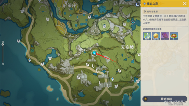 重岩之意任务简单,需要先回轻策庄找若心,然后在路上根据三处线索找到躲起来的小六。(千岩军嘉义想要送一份礼物给自己的女儿小六,但他实在抽不出空回轻策庄,正在找人帮忙)